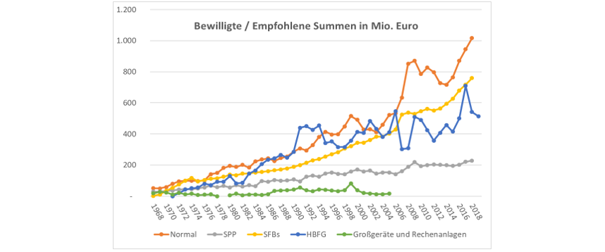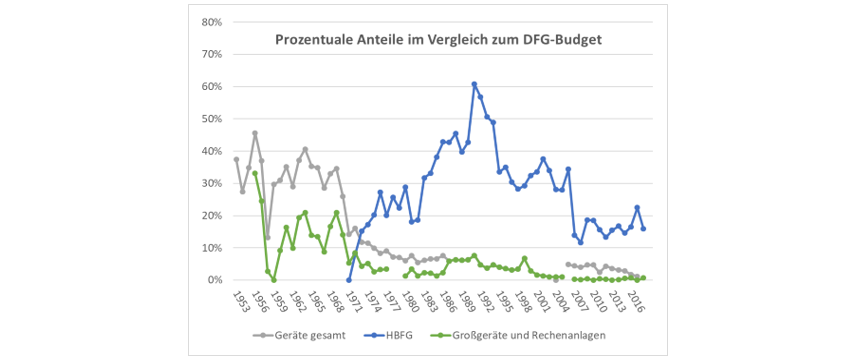 In den 50er und 60er Jahren war die Bewilligungsquote für DFG-Anträge vergleichbar mit der Bewilligungsquote des dann folgenden HBFG-Verfahrens, so dass anfangs vermutlich die DFG-Mittel für Geräte nach ähnlichen Gesichtspunkten und auf vergleichbaren Diskussionen beruhend vergeben wurden, wie dies im HBFG-Verfahren dann mit den Großgeräte-Empfehlungen weitergeführt wurde. Die beiden folgenden Kapitel zeigen, dass sowohl die technologischen als auch die strukturellen Diskussionen durchgehend geführt wurden, egal aus welchen Mitteln die betreffenden Geräte finanziert wurden.